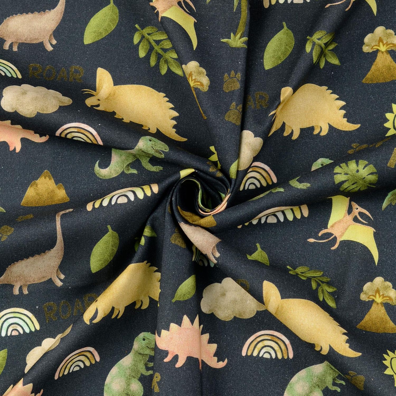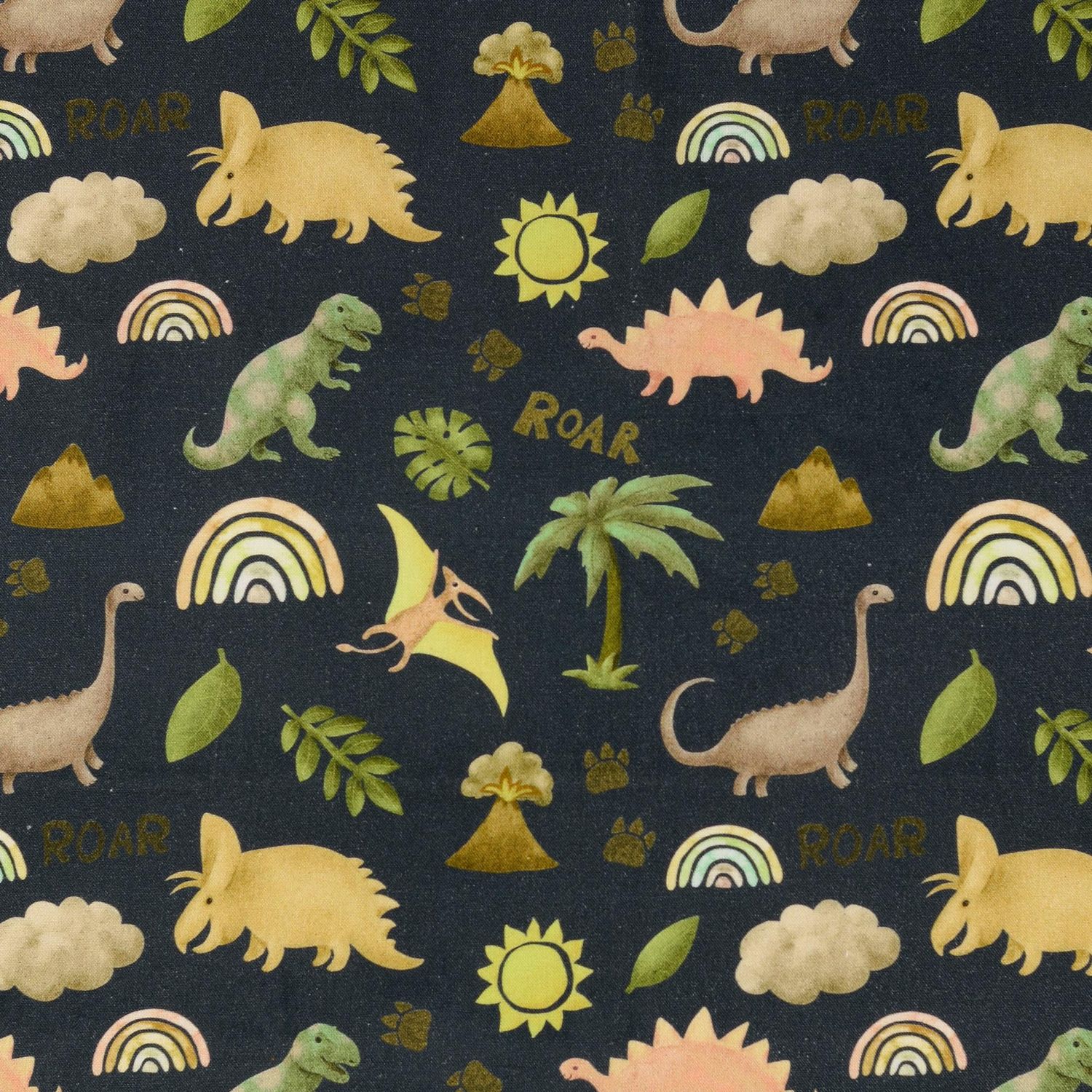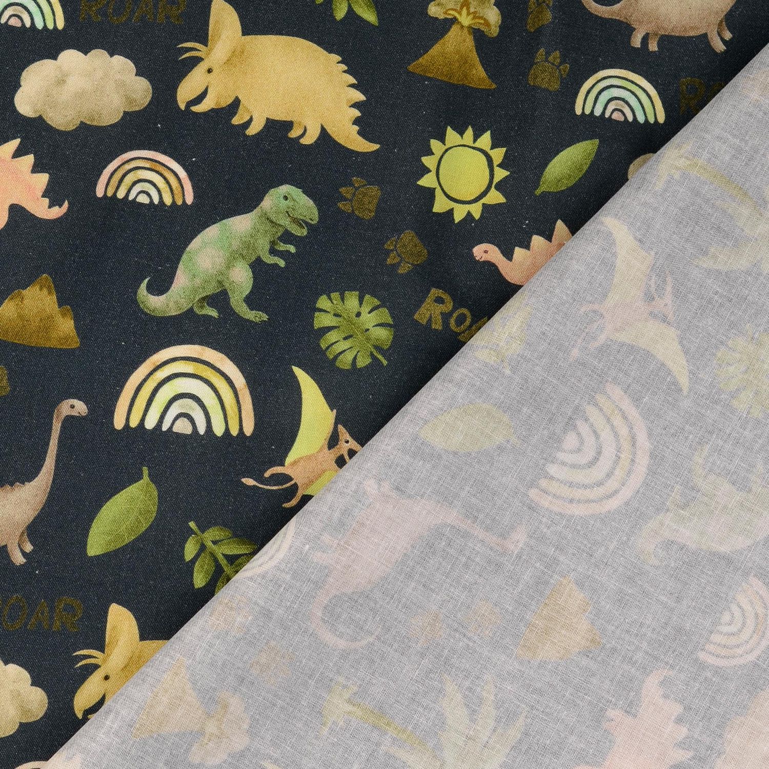 Tkanina jak z dziecięcych marzeń: Na głębokim granatowym tle bawią się radosne dinozaury, kolorowe tęcze i małe gwiazdki. Figlarne dinozaury w delikatnych zielonych i niebieskich odcieniach łączą się z subtelnymi pastelowymi kolorami – harmonijna kompozycja, która od razu poprawia nastrój.