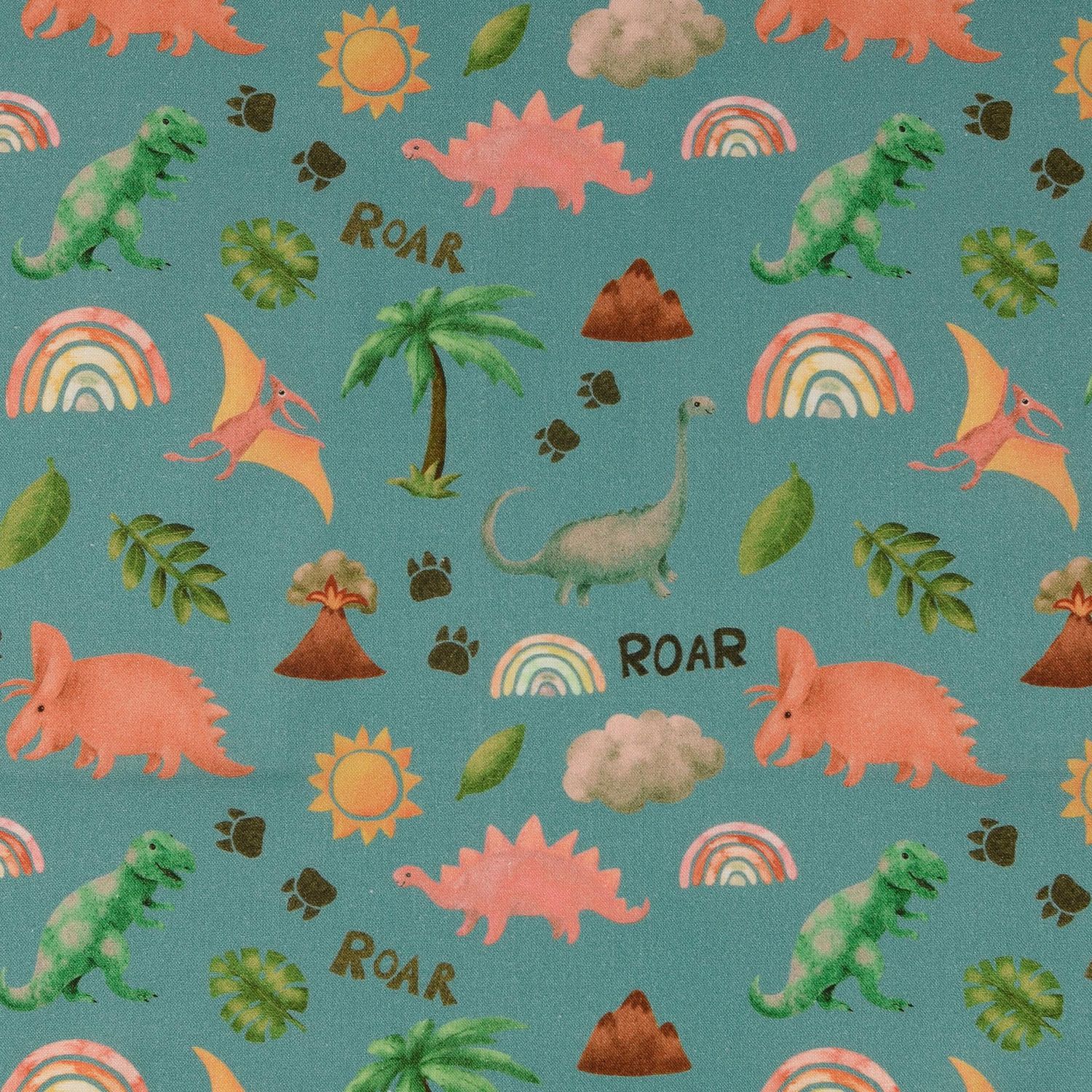 Ten wzór jest idealny dla wszystkich małych fanów dinozaurów: doskonały na pościel, poduszki, zasłony do pokoju dziecięcego, projekty patchworkowe, worki na gimnastykę, pojemniki lub słodkie pomysły dekoracyjne. Harmonijna paleta kolorów z petrol, pastelową żółcią, delikatnymi różowymi i turkusowymi odcieniami świetnie się komponuje i pasuje zarówno do pokoi dziewczynek, jak i chłopców.