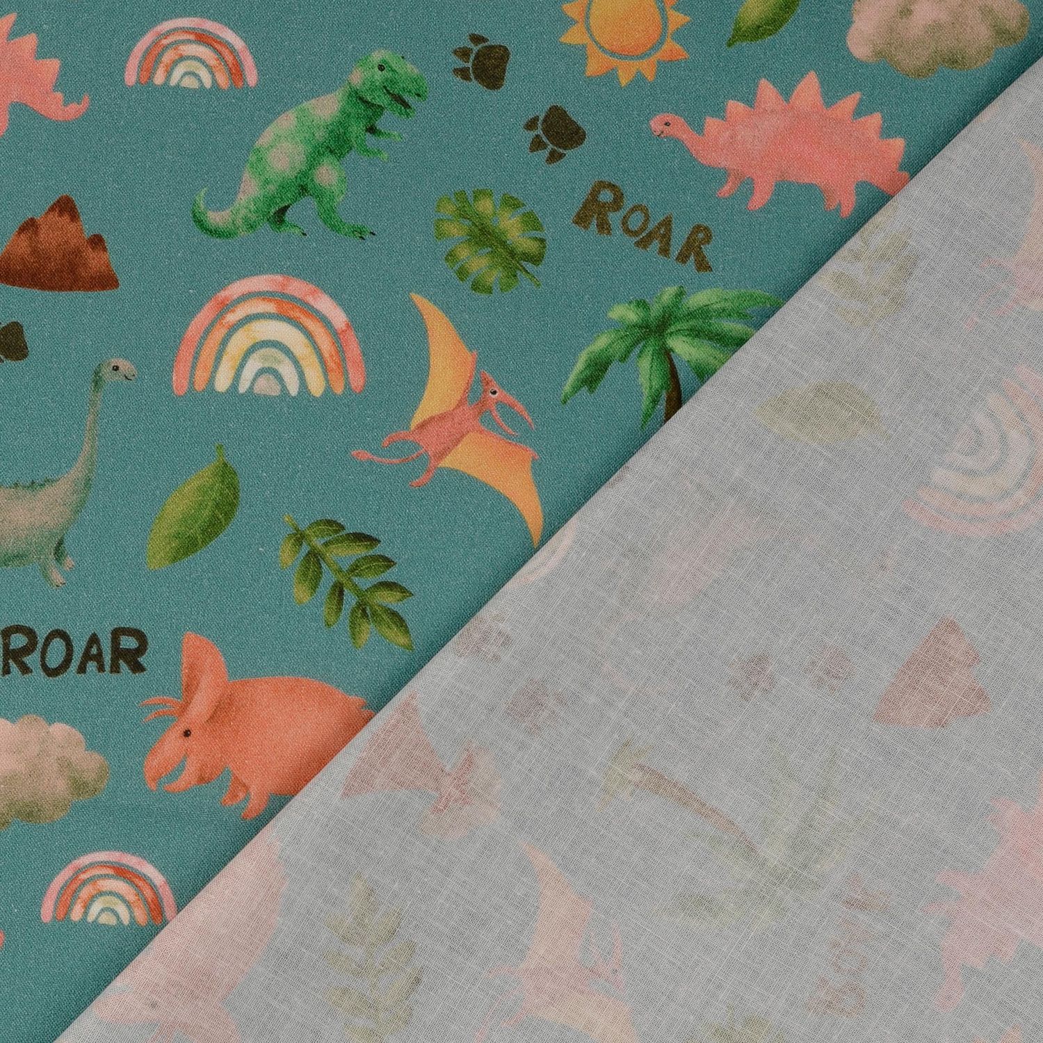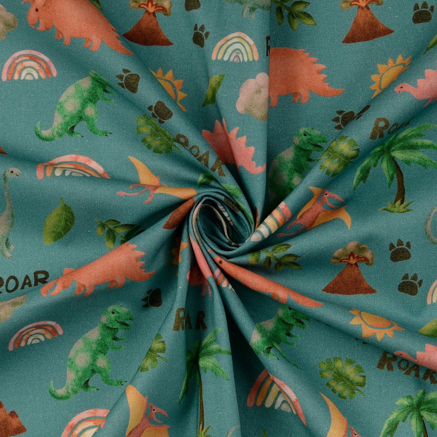 Bawełniana Kreton - Druk Cyfrowy Dinozaury i Tęcze Petrol