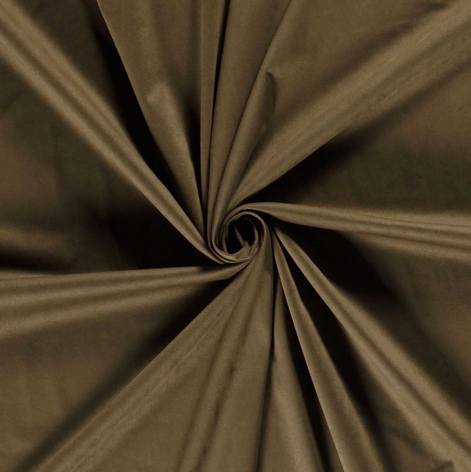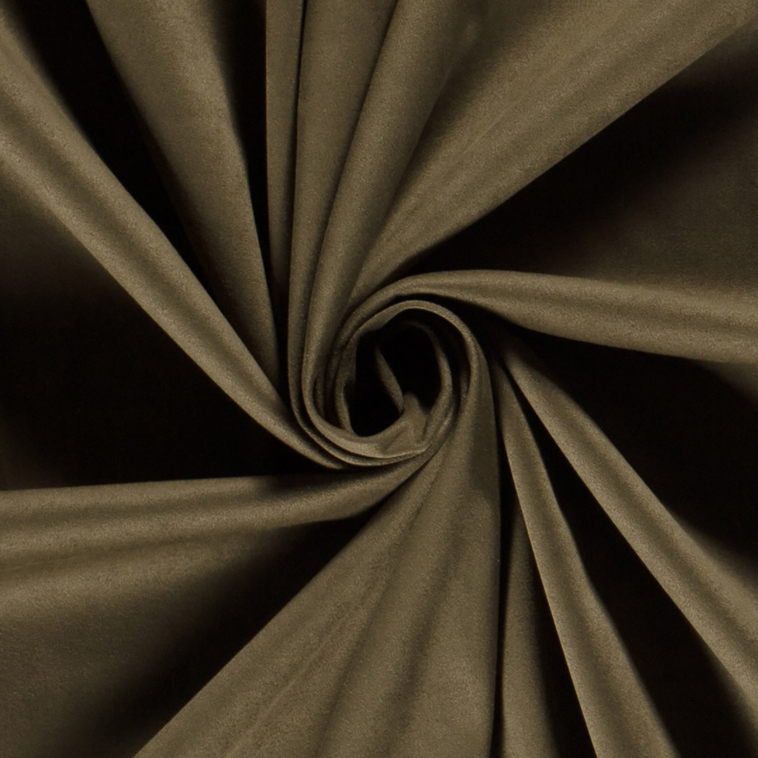 Ten elegancki materiał scuba o wyglądzie zamszu prezentuje się w głębokim, khaki zielonym kolorze, który jest jednocześnie nowoczesny i ponadczasowy. Powierzchnia wizualnie przypomina delikatny, szczotkowany zamsz, nadając tkaninie elegancki, lekko aksamitny wygląd.