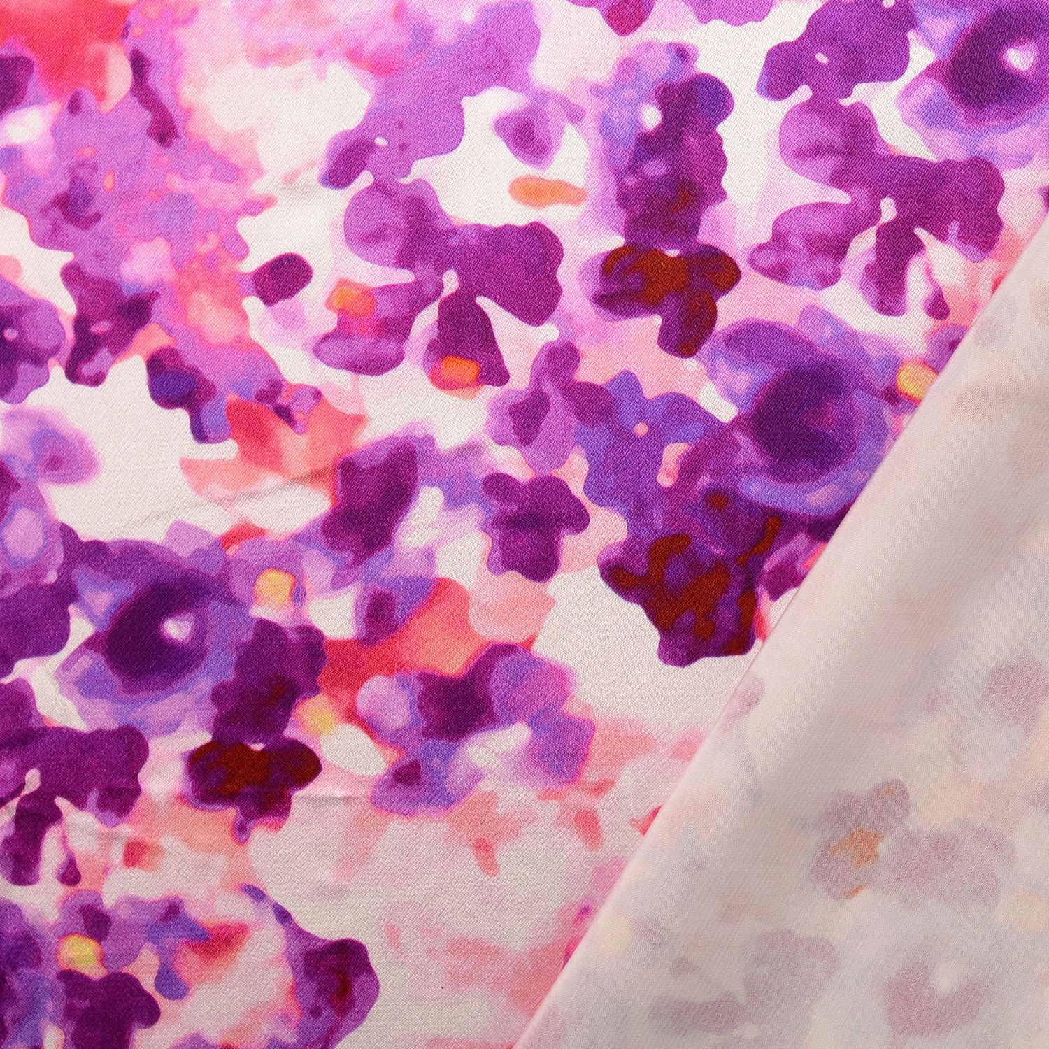 Dotyk akwareli na płynnej satynie: Ten wymarzony materiał zachwyca artystycznym wzorem w delikatnych odcieniach fioletu i różu, które łagodnie się przenikają. Jak malowane pędzlem, przejścia kolorów wydają się lekkie, żywe i zarazem eleganckie – idealne dla tych, którzy cenią wyjątkowość.