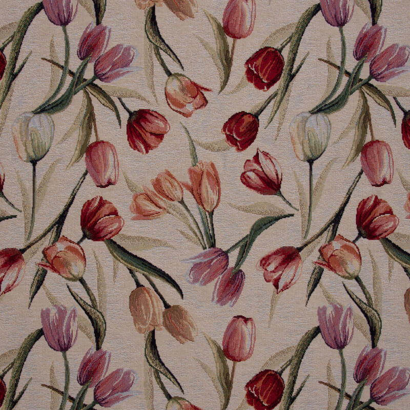 Elegancka tkanina gobelinowa z pięknie wykonanym motywem tulipanów: delikatne kwiaty w ciepłych odcieniach czerwieni i różu, podkreślone subtelnymi odcieniami zieleni w liściach, rozwijają się na wyrafinowanym beżowym tle. Tkana struktura nadaje kwiatowemu wzorowi szczególną głębię, sprawiając, że tulipany wydają się niemal trójwymiarowe i nadając tkaninie luksusowy wygląd.