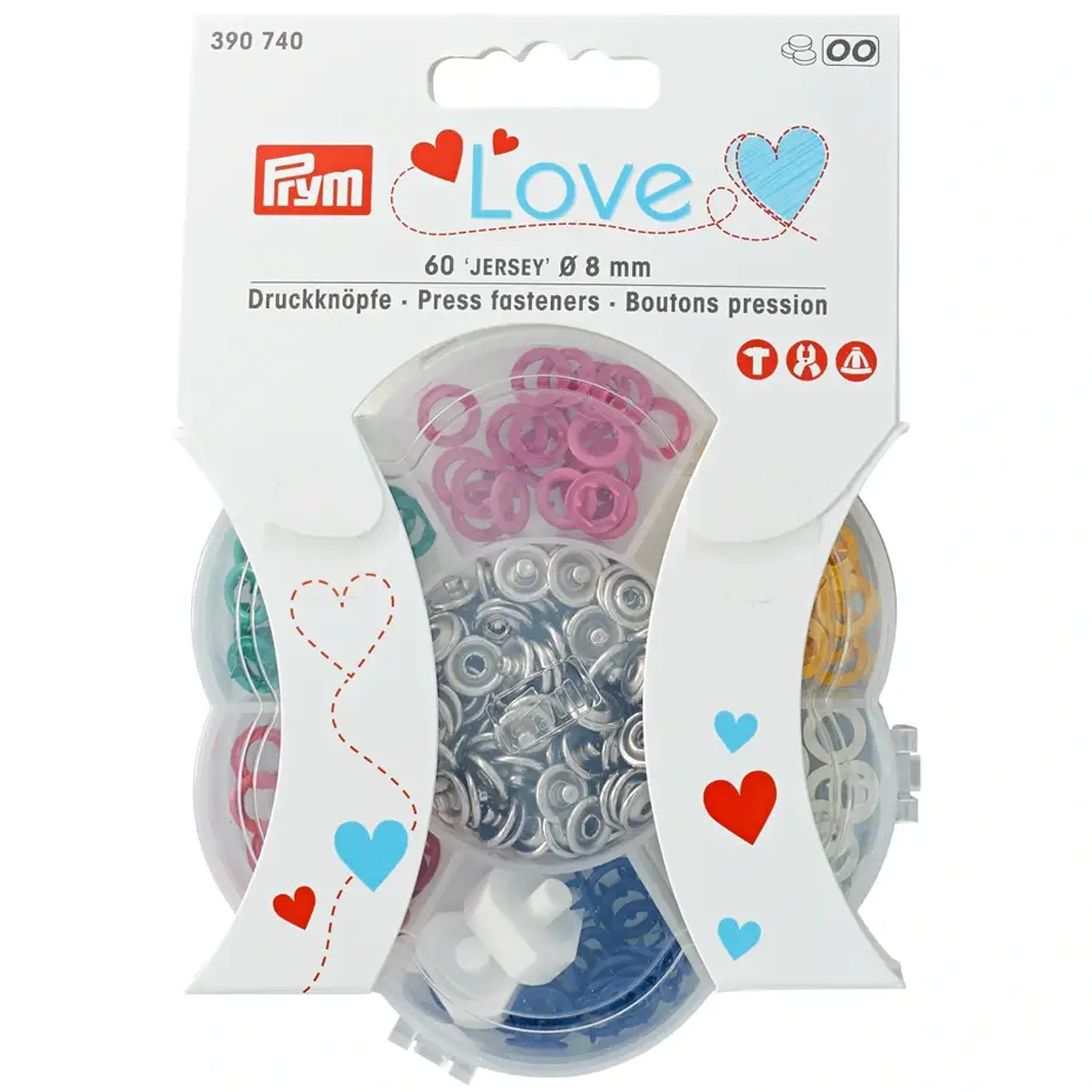 Ten praktyczny zestaw Prym LOVE wniesie świeży kolor do Twoich projektów krawieckich: W przezroczystym pudełku czeka na Ciebie 60 małych ćwieków w wesołych kolorach. Delikatne, okrągłe główki są idealne do ubranek niemowlęcych, dziecięcych, koszulek, body, lekkich kurtek lub akcesoriów wykonanych z delikatnych, elastycznych tkanin.