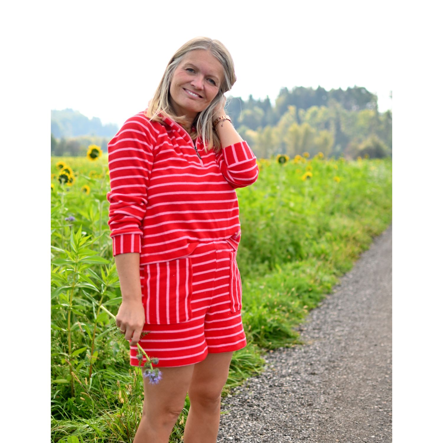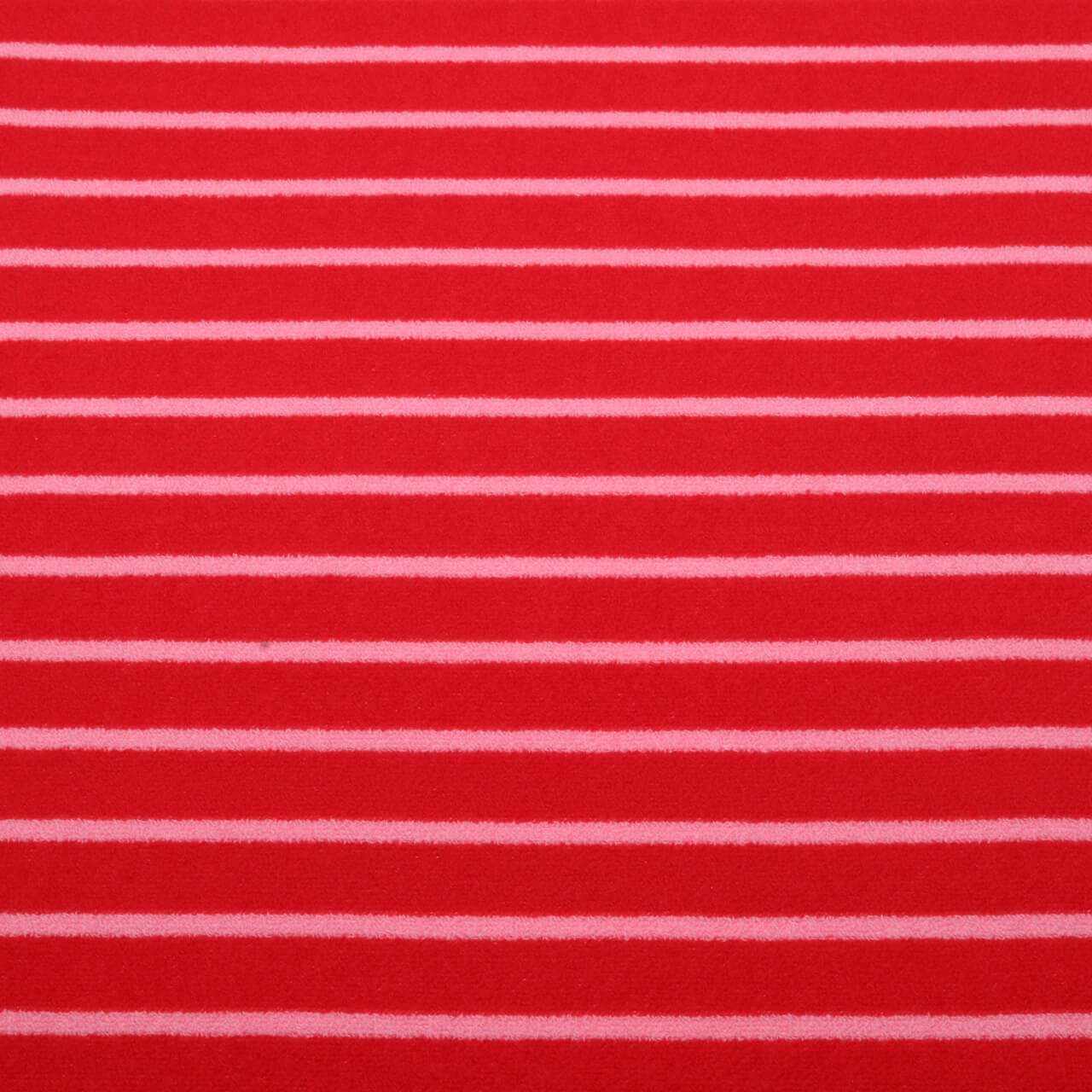 Ten ręcznikowy dżersej natychmiast przyciąga wzrok wesołymi paskami w jaskrawej czerwieni i delikatnym różu. Aksamitna, puszysta powierzchnia zachęca do przytulenia się i jest cudownie miękka w dotyku. Dzięki przyjemnej elastyczności tkanina pięknie dopasowuje się do skóry i jest wygodna w noszeniu przez cały dzień.