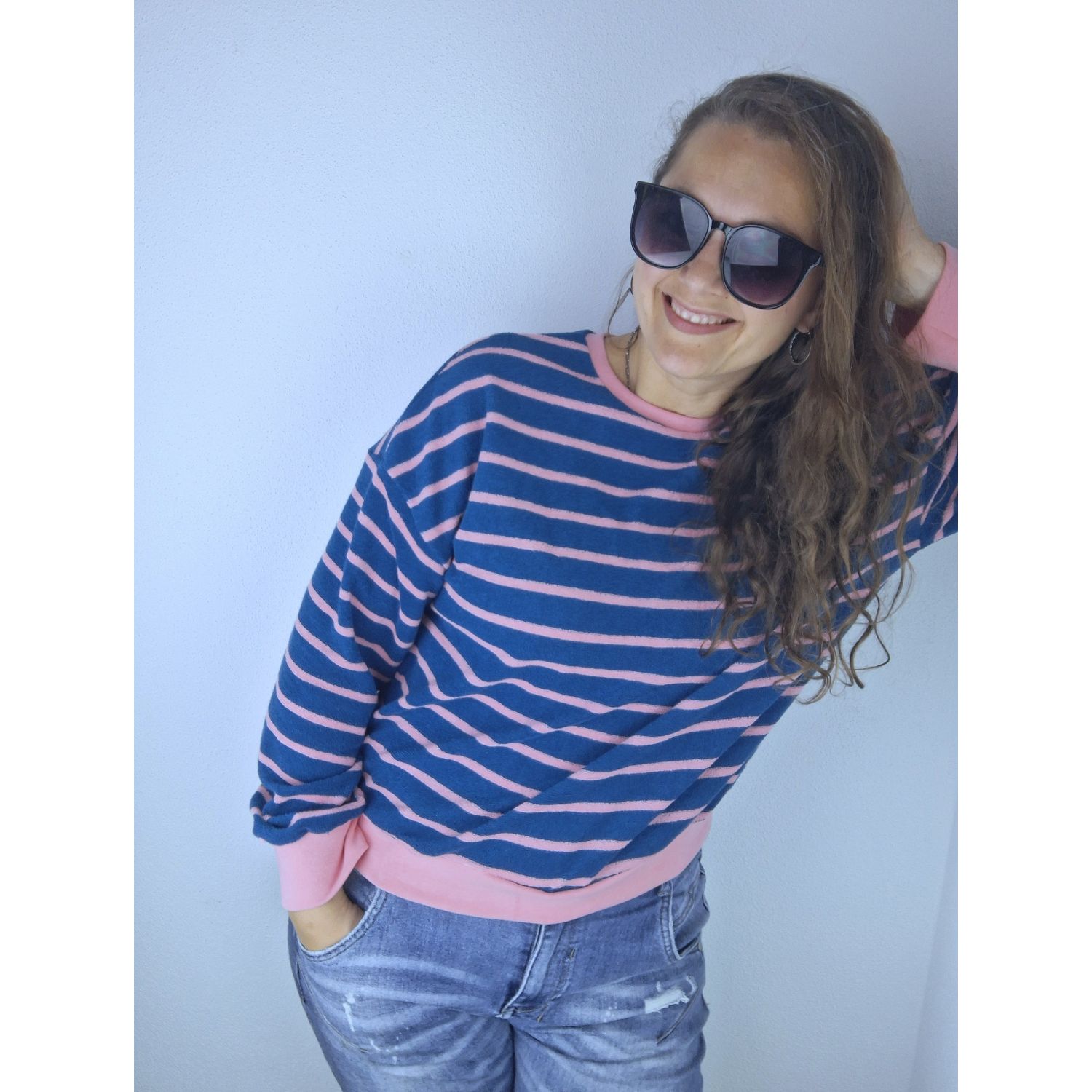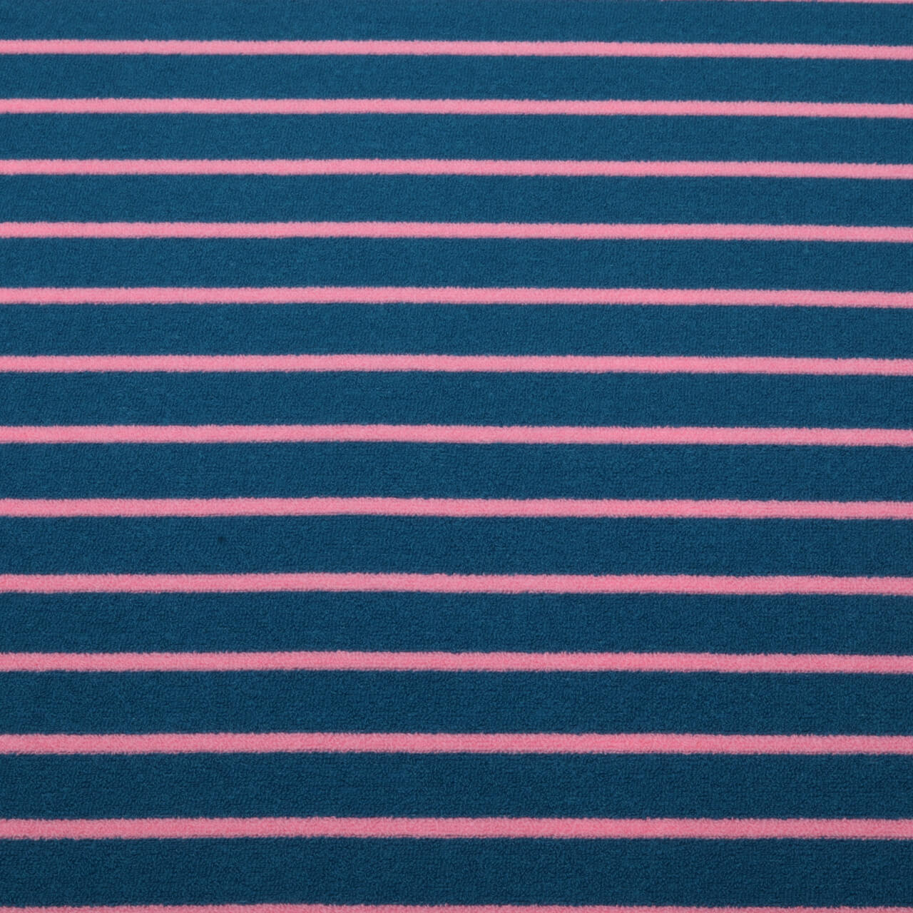 Ten ręcznikowy dżersej łączy w sobie przytulność ze świeżym, nowoczesnym wyglądem. Miękki materiał pętelkowy delikatnie przylega do skóry, a wyraźne paski w kolorze głębokiego błękitu benzynowego i delikatnego różu przyciągają wzrok. Subtelny kontrast odcieni kolorów daje żywy, ale nie przytłaczający efekt - idealny dla każdego, kto lubi przytulny, ale modny wygląd.