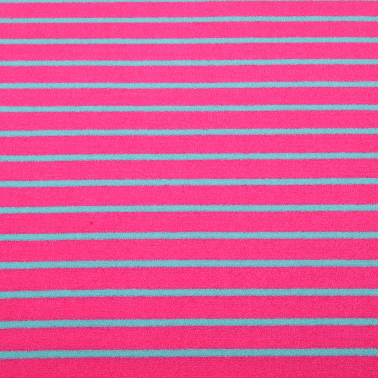 Ten przytulny, miękki dżersej frotte z typowym wzorem w paski przyciąga wzrok: jasny róż łączy się ze świeżym aqua, tworząc wesoły, nowoczesny wygląd, który natychmiast wprawi Cię w dobry nastrój. Miękka struktura pętelkowa nadaje tkaninie przyjemnie antypoślizgową powierzchnię, a także sprawia, że jest przytulna w noszeniu.