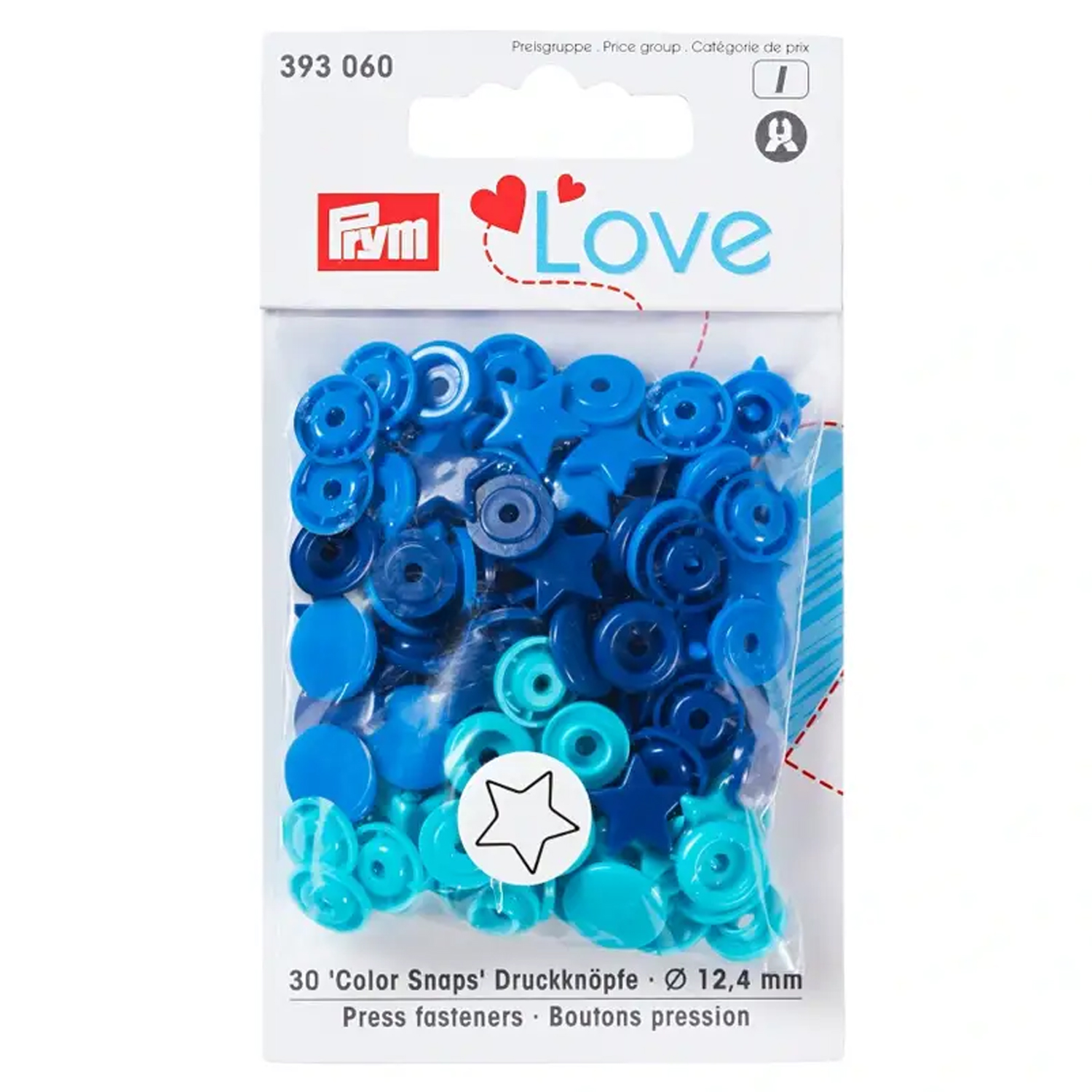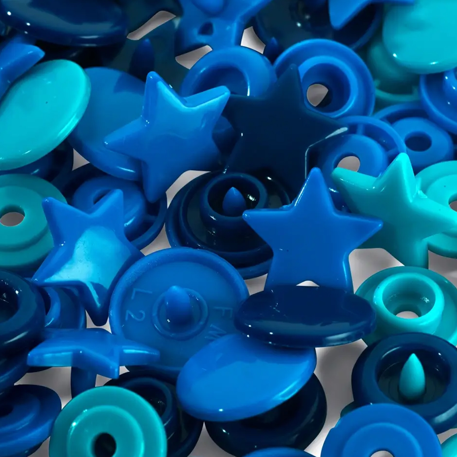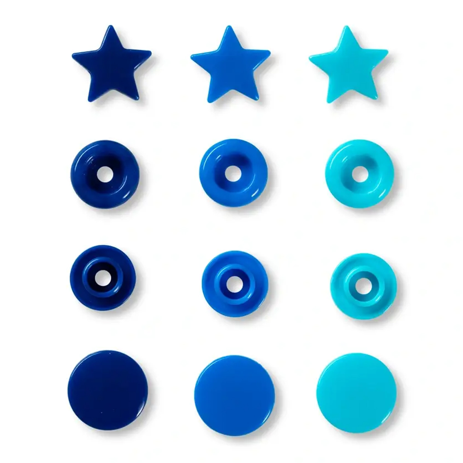 Dzięki zatrzaskom Prym LOVE w kształcie gwiazdek możesz w mgnieniu oka wyczarować wesołe akcenty na swoich projektach krawieckich. Małe gwiazdki mienią się harmonijną mieszanką niebieskiego, turkusowego i głębokiego atramentowego błękitu - idealne do kolorowych ubrań dla niemowląt i dzieci, ale także do toreb, akcesoriów lub pomysłów dekoracyjnych.