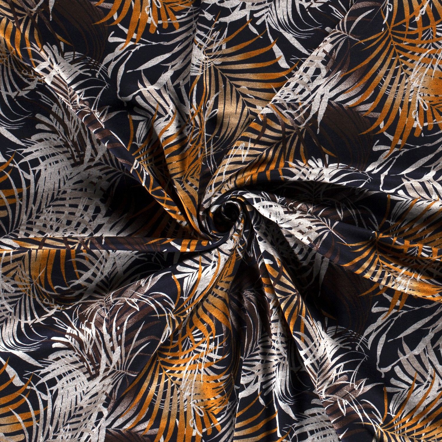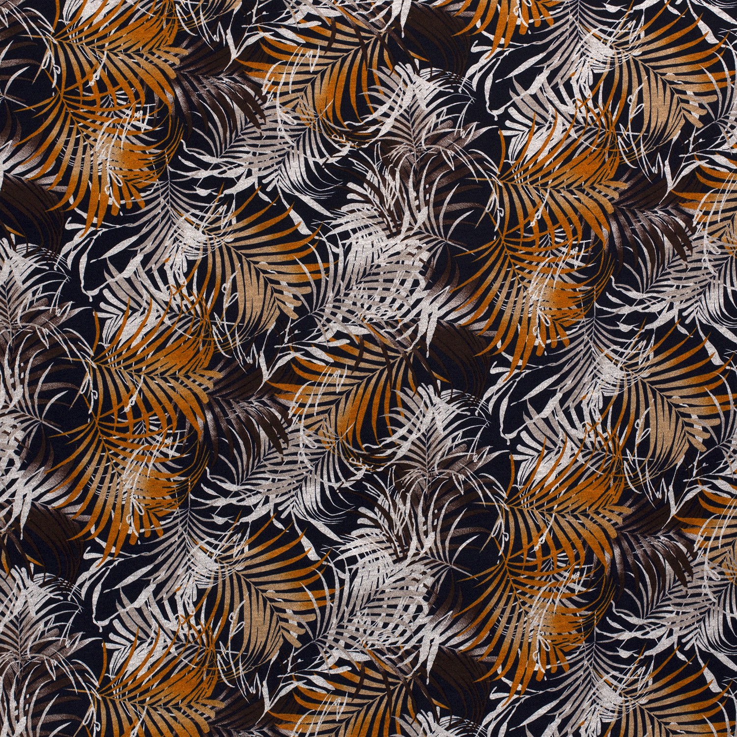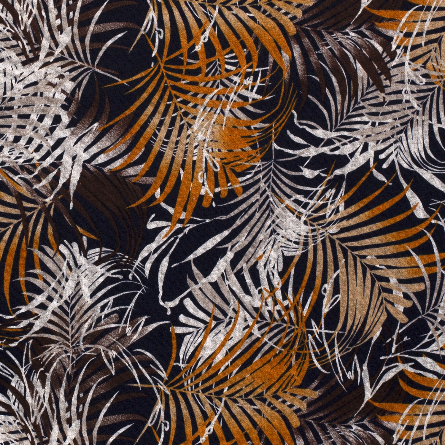 Odrobina tropikalnej elegancji dla twojej garderoby: na głębokim ciemnogranatowym tle rozpościerają się stylizowane liście palmowe w ciepłych odcieniach brązu i beżu. Liście wyglądają jak delikatnie rysowane, z cienkimi konturami i miękkimi przejściami kolorów – szlachetny, a zarazem naturalny wzór, który natychmiast przywołuje wakacyjny nastrój, bez przesadnej zabawy.