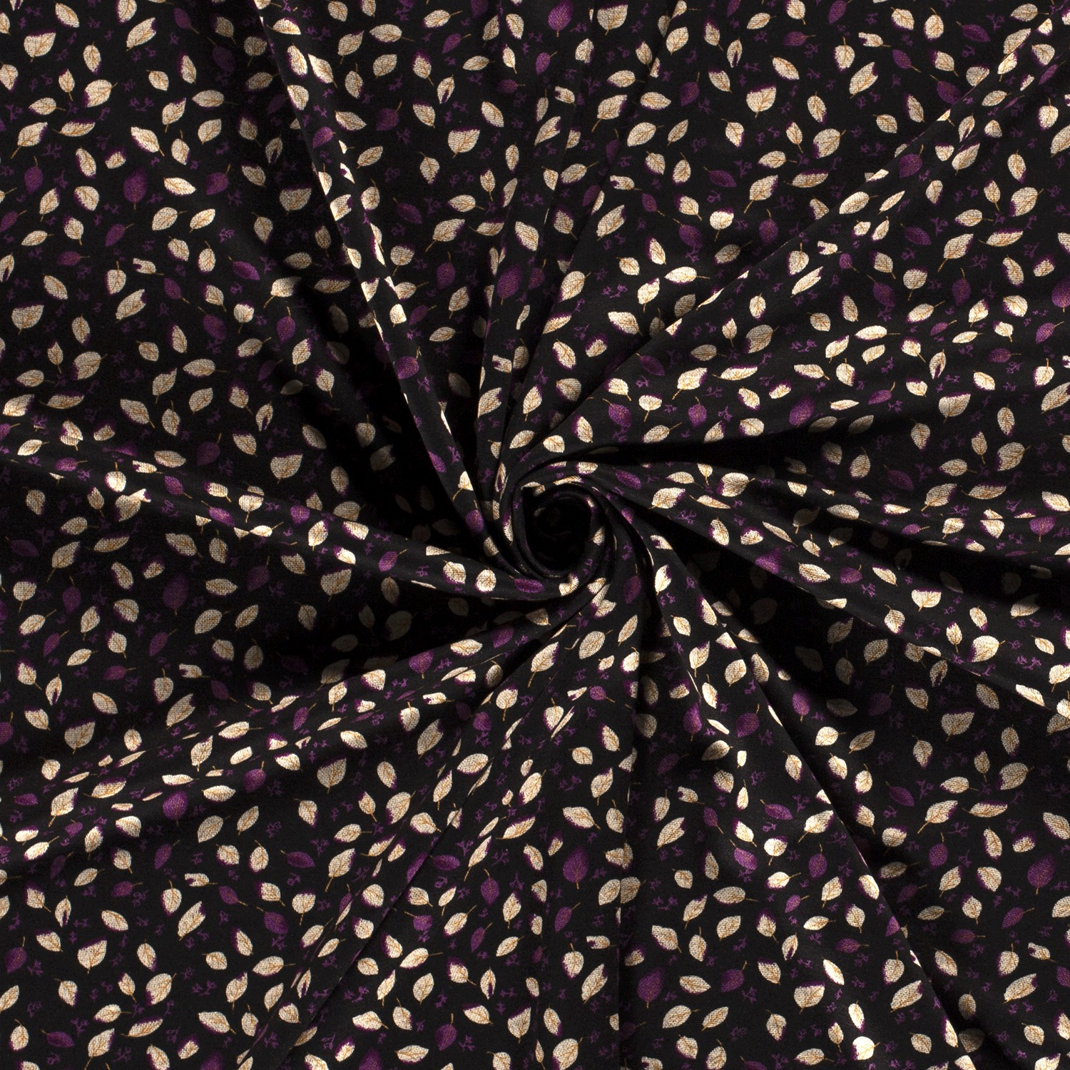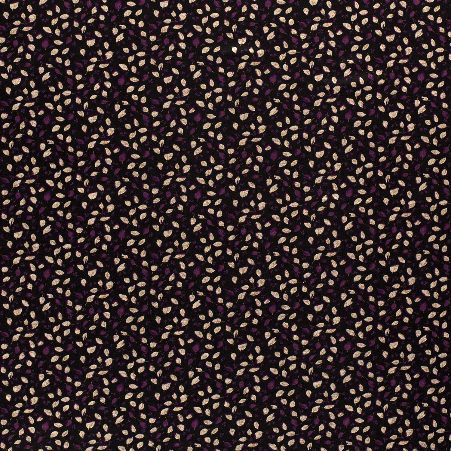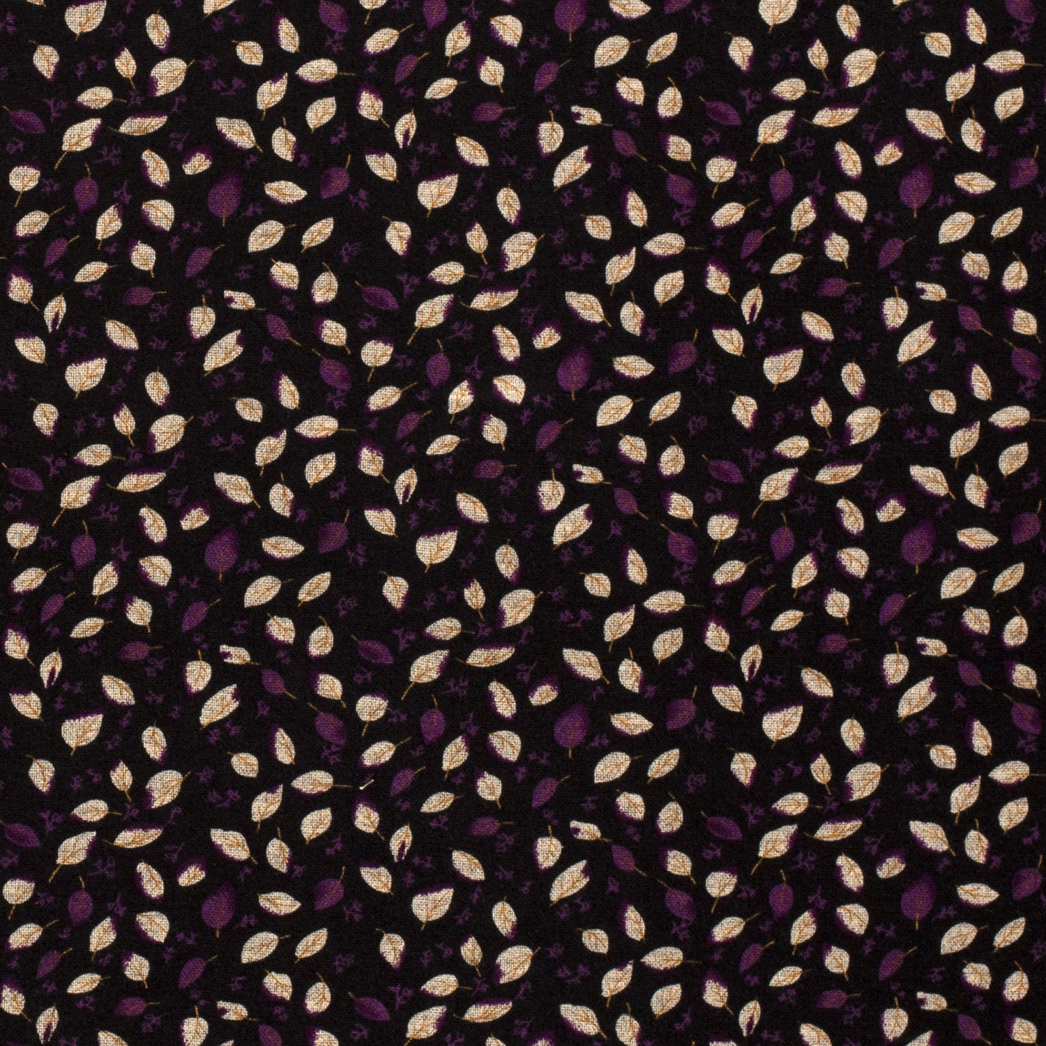 Elegancki Romanit Jersey z delikatnym, pełnym nadrukiem liści: subtelne małe liście i kwiaty w ciepłym beżu oraz szlachetnym fiolecie rozciągają się na głębokim czarnym tle, tworząc stylowy, lekko figlarny wzór.
