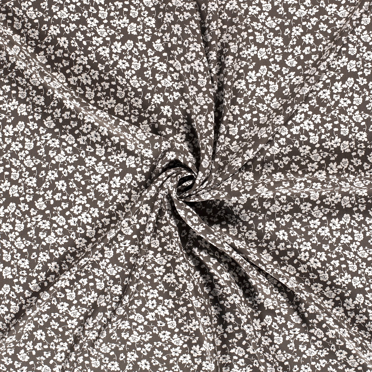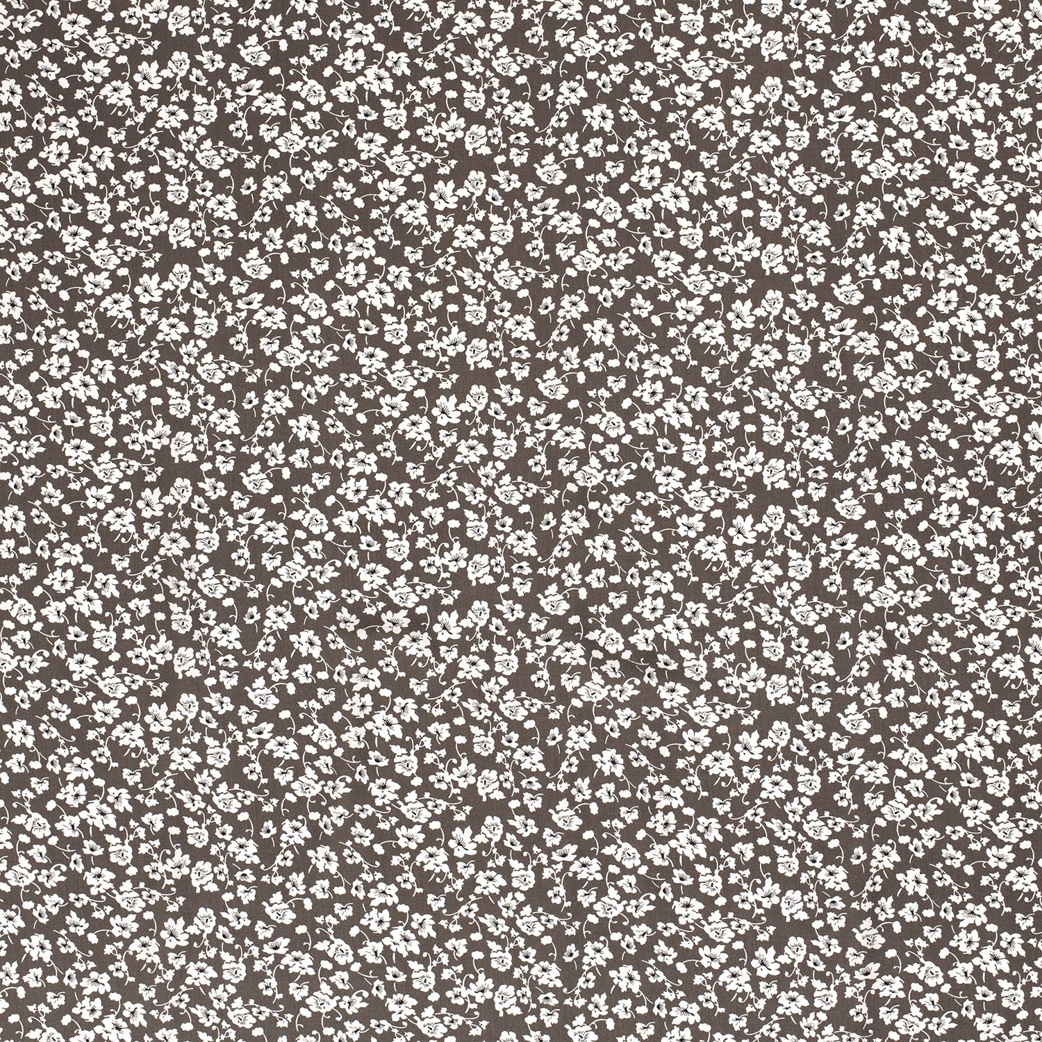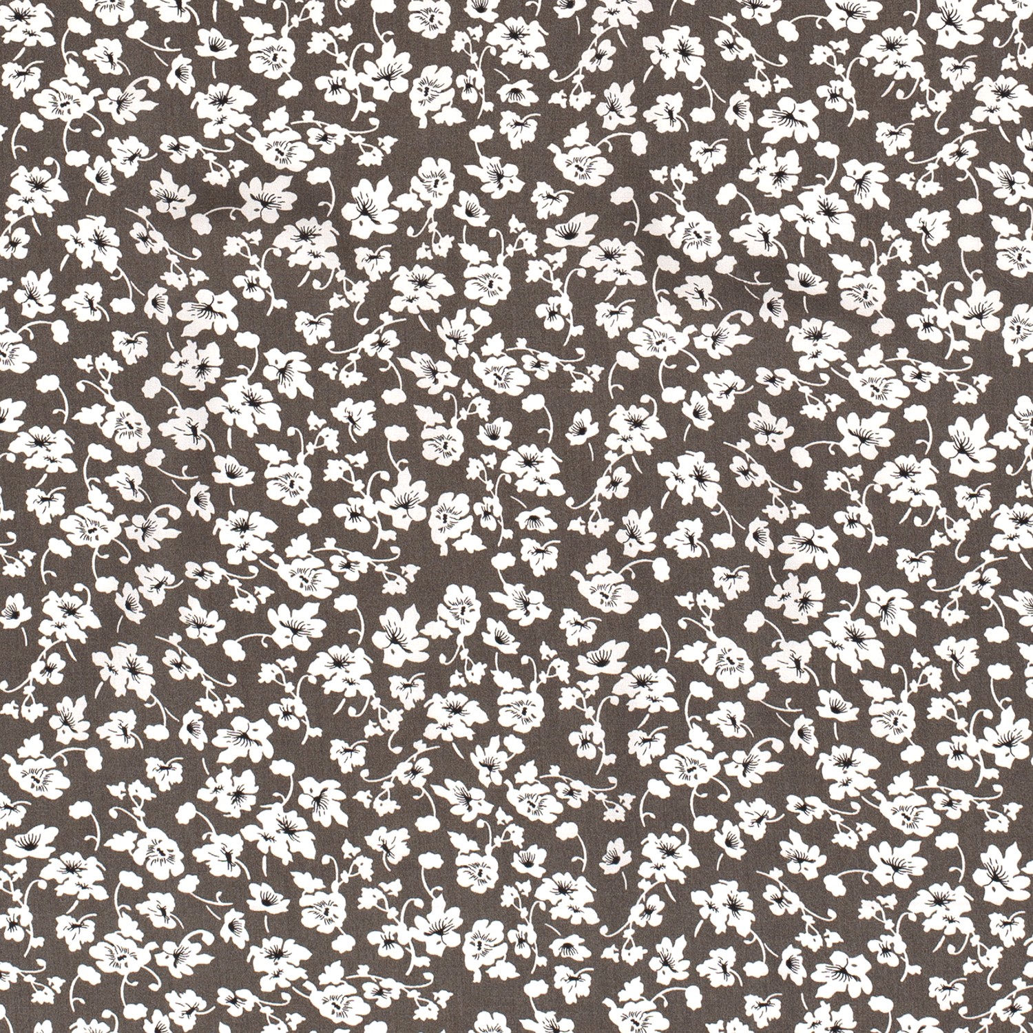 Delikatna jak wiosenny spacer: Na głęboko ciemnobrązowym tle kwitnie niezliczona ilość małych kwiatów jabłoni w kremowych i różowych odcieniach, między którymi pojawiają się drobne liście w delikatnej zieleni. Subtelny wzór kwiatowy wygląda żywo i jednocześnie bardzo elegancko – ponadczasowy wzór pasujący na wiele okazji.